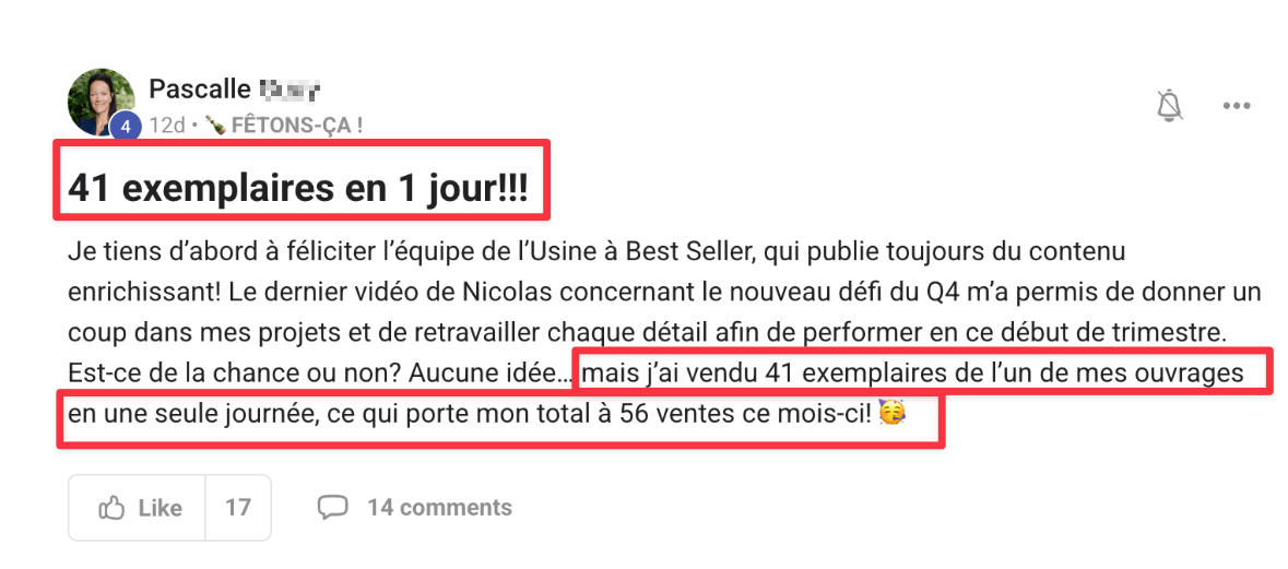 Vos résultats peuvent varier. Les témoignages et exemples utilisés sont des résultats exceptionnels et ne sont pas destinés à garantir, promettre, représenter et / ou assurer que quiconque obtiendra des résultats identiques ou similaires. Tous les témoignages utilisés sont bien réels et vérifiés, issus des membres du programme l'Usine à Best Sellers™. Ces membres ont pu obtenir une récompense en échange de leur témoignages via un système de gamification.